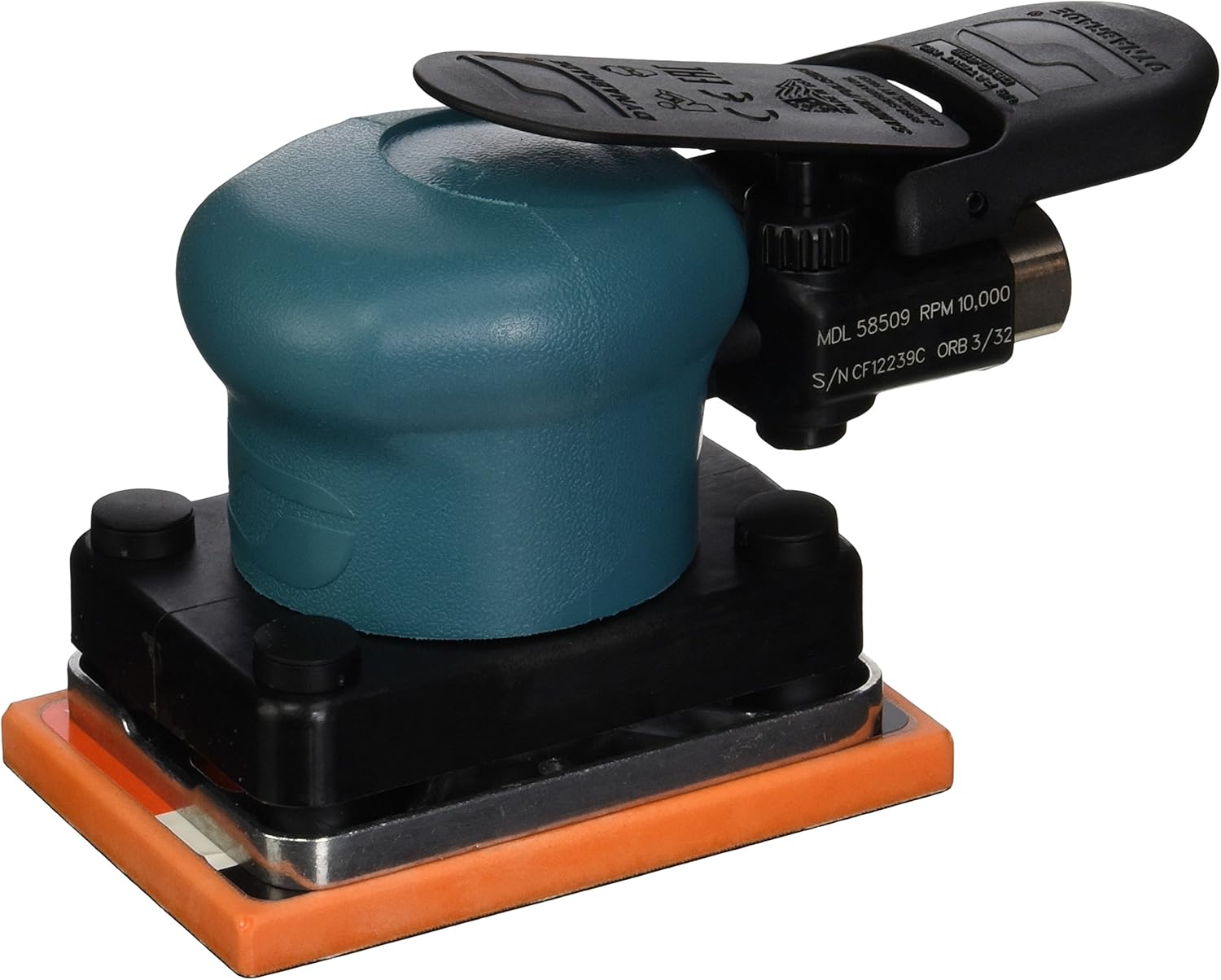 * Powerful .15 hp (112 W), 10,000 RPM air motor gets the job done in countless applications, utilizing just 13 SCFM (368LPM) at 90 PSI (6.2 Bar).* Precise 3/32" orbital motion is ideal for achieving a controlled, ultra-fine finish on a variety of surfaces. Compact size is ideal for all operators, including those with smaller hands.* Engineered and tested to ensure less tool vibration than any competitive model! Lighter tool weight minimizes hand and arm fatigue. Perfect for vertical applications.* Rectangular shape sands deep into corners, where round pads cannot reach.* Includes 56355 Vinyl-Face Sanding Pad, 74 mm wide x 109 mm long (approximately 3" x 4-1/4"). Comfort Platform provides additional hand and wrist support, further enhancing operator comfort. Also offers increased protection against cold air exhaust. (NOTE: Comfort Platform is removable.) Order 59330 Comfort Platform (U.S. Patent No. D610,428) separately, to install on existing tools!